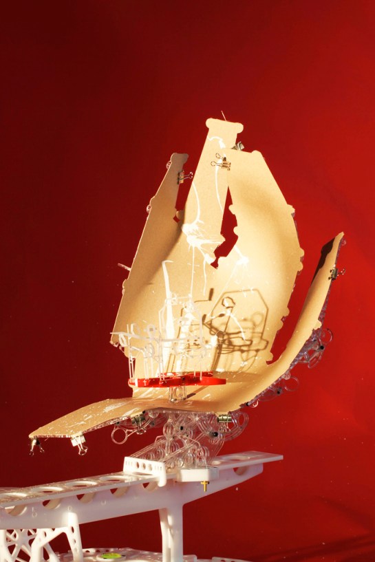 The test drawing (above) shows one of the key problems with instrument four (and five). The folding picture plane is behind the drawing pieces so that the subtle splatters from the thrown paint hitting the drawing pieces are obliterated by the main thrust of the flying paint. At this stage the paint is standard interior house paint. In subsequent drawings it is thickened with acrylic thickening gel.