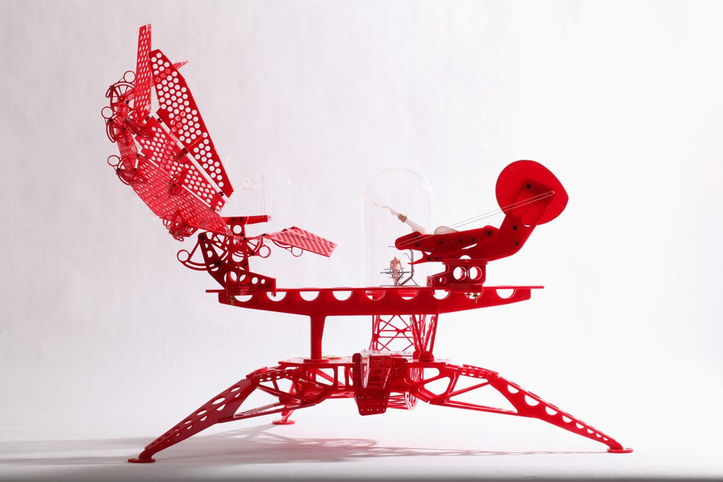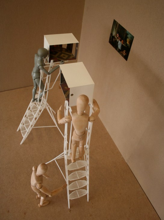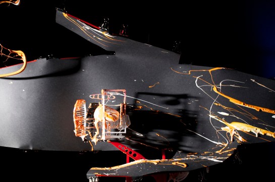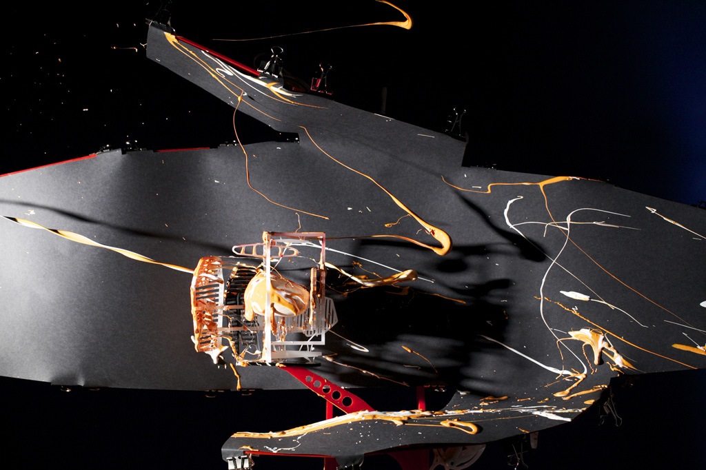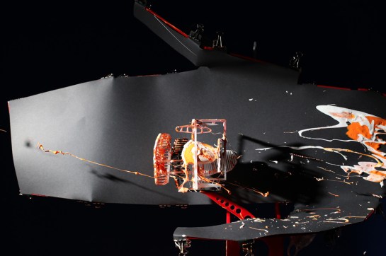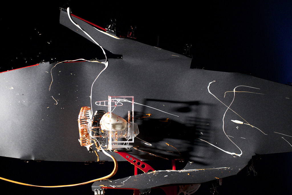 In the picture above you can see the view the catapult that is going to throw paint has of Instrument Five. As noted earlier, having the folding picture plane behind the drawing pieces means that many of the subtle splatters of deflected paint are obscured by the main body of paint that misses the drawing pieces and deposits a large splat of paint on the picture plane. The same instrument can be seen below, showing this relationship from the side.