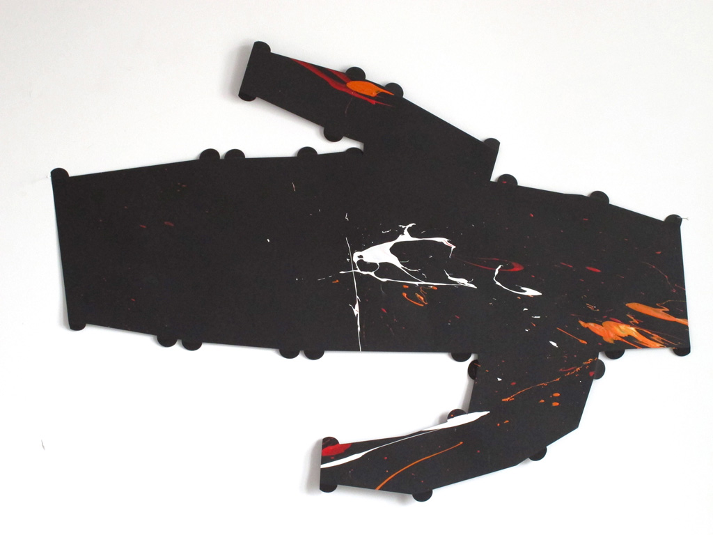 Instrument Seven has the same chassis as Instrument Five but has a new picture plane that sits adjacent to the flight of the paint (see below). The folding picture plane has adjustments between each individual plate plus the whole picture plane can rotate slightly. The plane is set up so that the area closest to the drawing pieces forms a harbour to protect that part from a direct flight of paint. Some of the direct flight can catch the back end of the picture plane (or the front if the catapult is turned far enough.