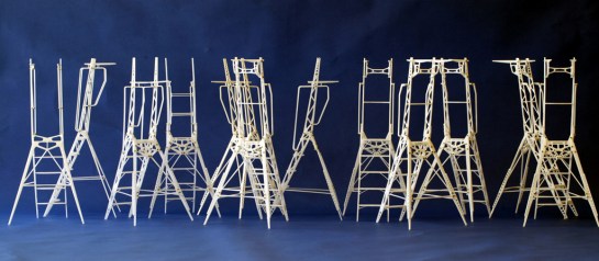 The Instrument Seven drawing pieces are also developed to be more robust and larger targets for the paint. We are no longer discussing the Bird Automata test track in this instrument – the drawing pieces shown here are a media test to push some of the thoughts about what the drawing pieces could achieve. There is a main wooden piece that is protected by a number of slatted screens. as the paint penetrates the screens to cover the wooden piece the slats become more opaque to the flying paint.