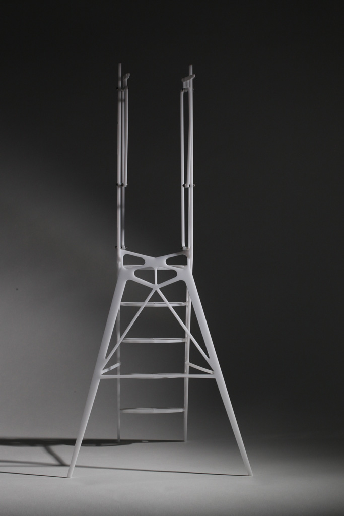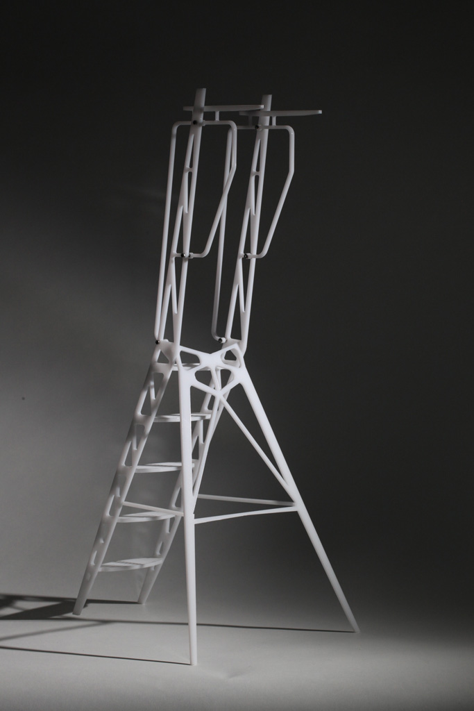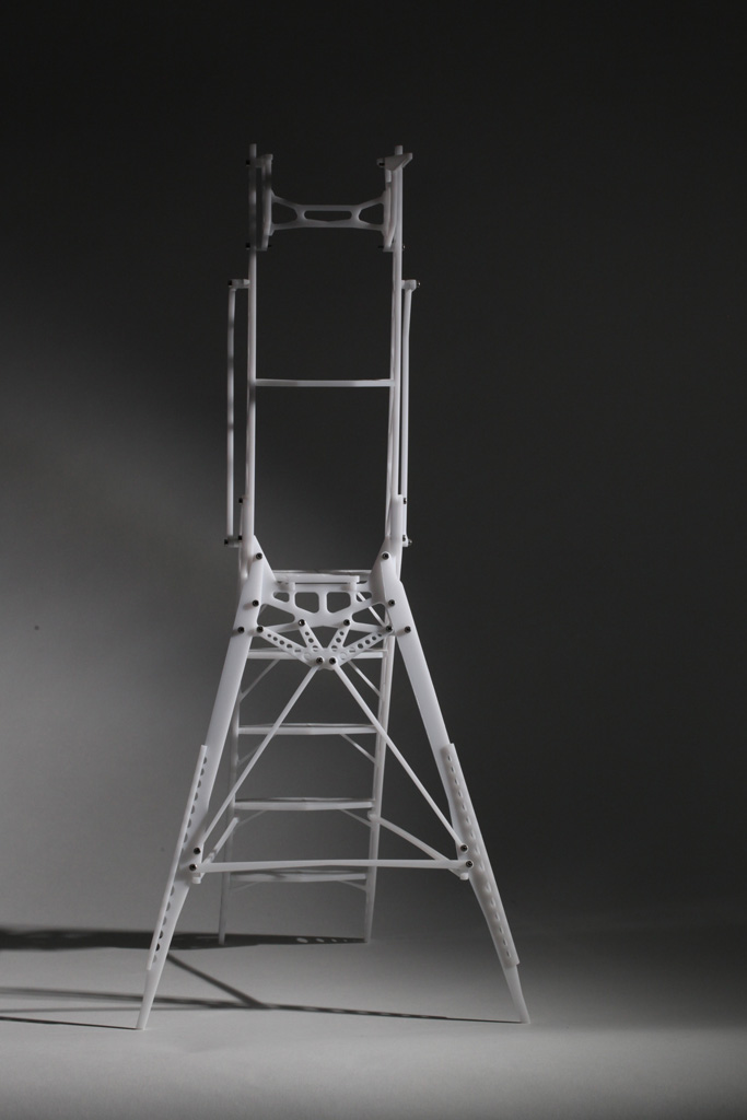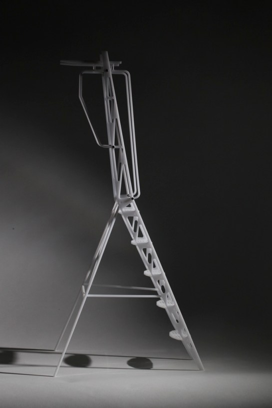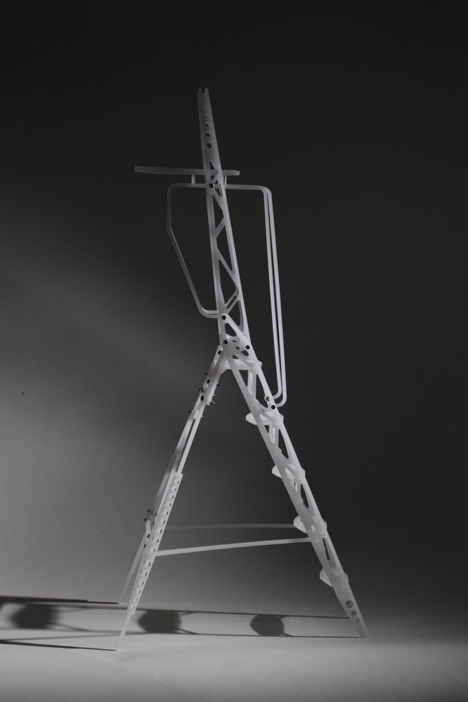 The instruments at this stage work between a vertical drawing on the wall and a horizontal one on the table. The observer can work with the vertical drawing through a headset fixed to a bracket on the wall. At this stage the folding picture plane is separated from the drawing instrument chassis.