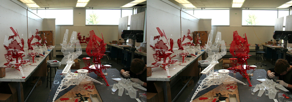 I have quite a bit more work to do before the new instruments are worth posting so here is a picture of Instruments Five and Six being assembled and Instruments Four being refitted. The white instrument in the middle foreground is an instrument four and the red one to its right is an instrument five. Behind them on the back worktop (in a studio that is normally used by students – this was taken in the summer before last) is Instrument Six. The instruments lined up on the left are mostly Instrument Fives with one Instrument Four. Several people have asked me how large the instruments are, so this gives some idea of the scale. Each one will fit in a one metre cube.