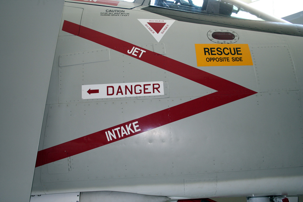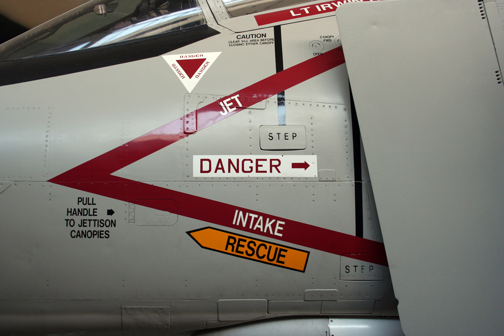 The surfaces of civil and military aircraft are covered with written instructions. These prescribe how well-trained people should work on and operate the thing. was wondering how one might employ similar tactics in architecture, not to prescribe how to occupy architecture but to bring habitual occupation into question. The detail examples here are from an American Navy F4 at Duxford and the full aeroplane shown (mothballed) at AMARC in Tucson. I have a few more miscellaneous examples that I will post another day.