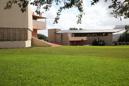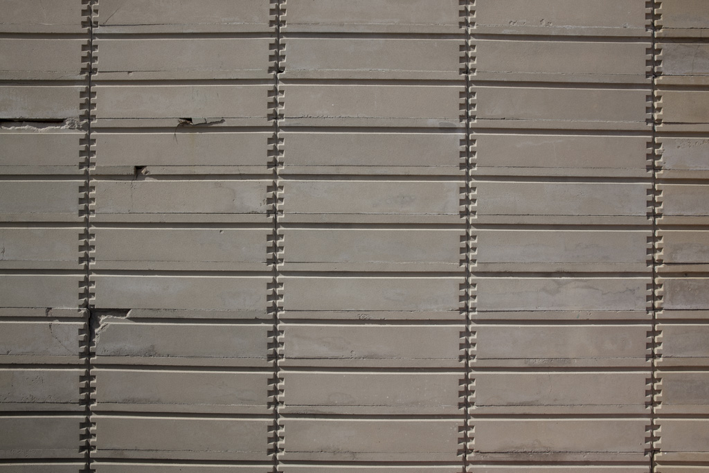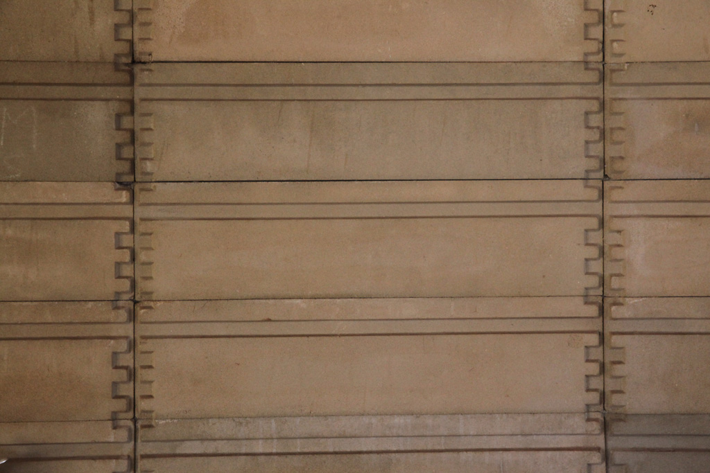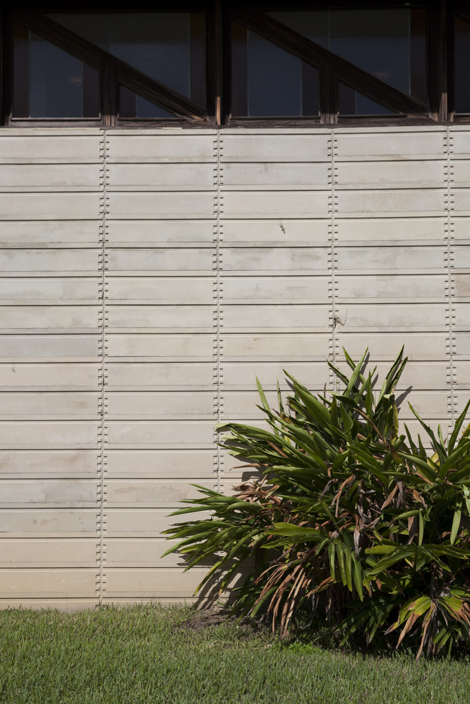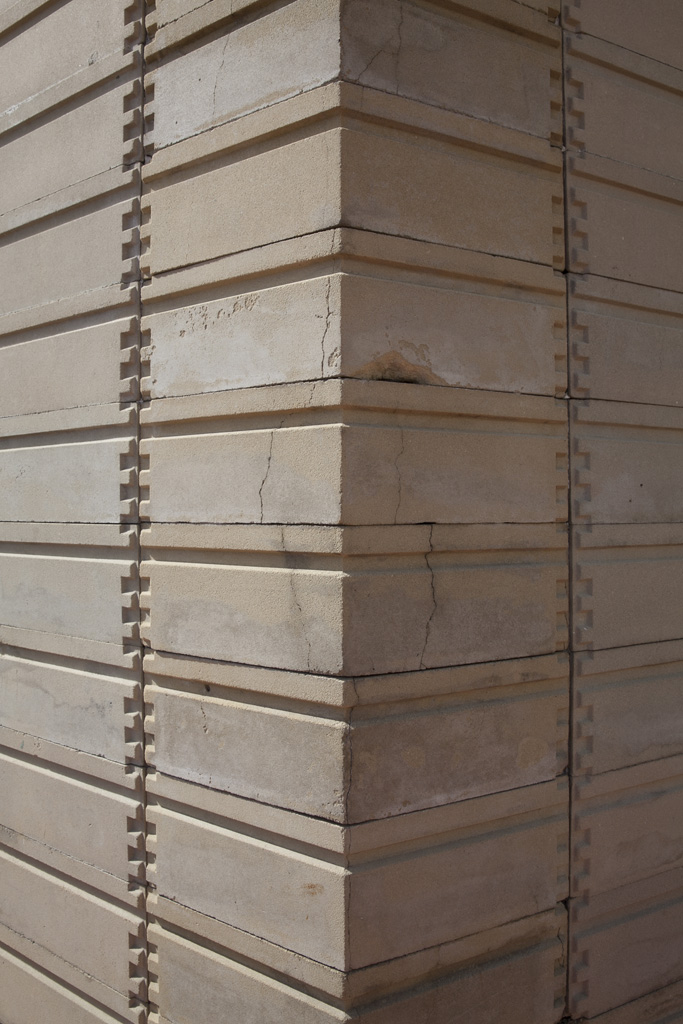 A few more details of the Frank Lloyd Wright blocks at the Southern Florida College, Lakeland. The William H.Danforth Chapel has simpler blocks than in the adjacent Annie Pfeiffer Chapel shown in previous posts. There is the same stack bond and cavity wall but the surface elaborations are simpler. The Annie Pfeiffer Chapel blocks carry a figure that runs across pairs of blocks horizontally. In the William H.Danforth Chapel the horizontal joint is not where you might immediately expect, but sits just above the horizontal indent to form a subtle second subdivision, so the figure of the blocks is connected vertically. You can see this most clearly on the corner detail. It was completed in 1955.