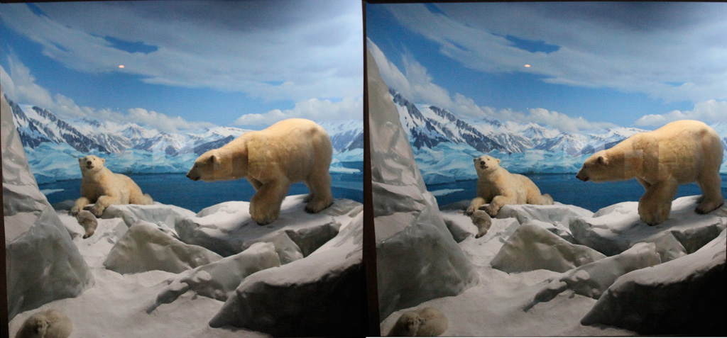 Some more stereo views of the dioramas at the Natural History Museum in Los Angeles. The Walrus group is a popular subject for dioramas. There is a beautiful one at the American Museum of Natural History with a background painting by Francis Lee Jaques. When a taxidermist took me round the dioramas at the Zoological Museum in Copenhagen the thing he was most proud of was the representation of excrement on the show and ice. The natural history museum in Stockholm has a similar fascination with faeces. Such polution clearly made much less of an impression on the American surveys, for in both examples the snow is a pure white.