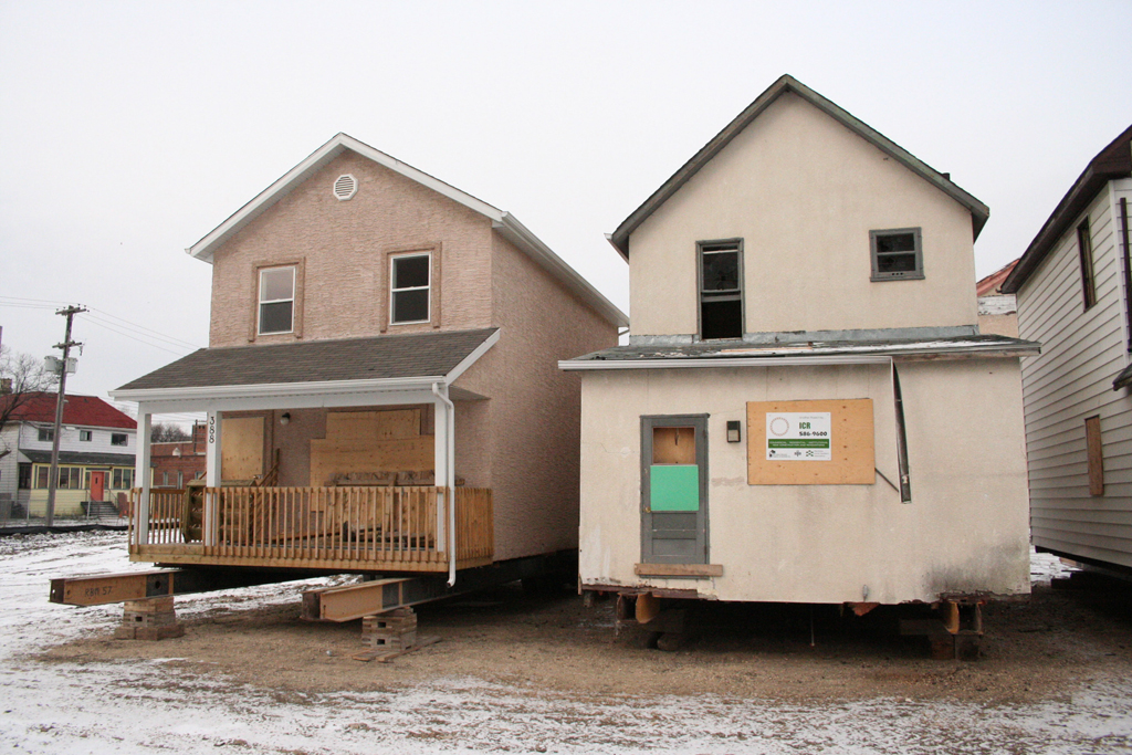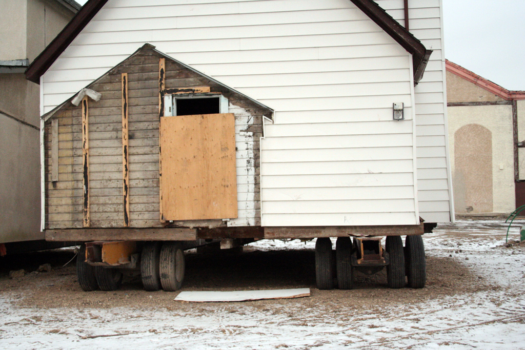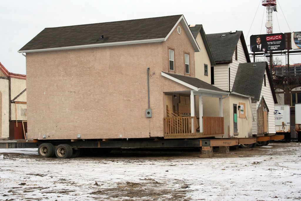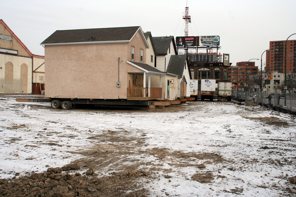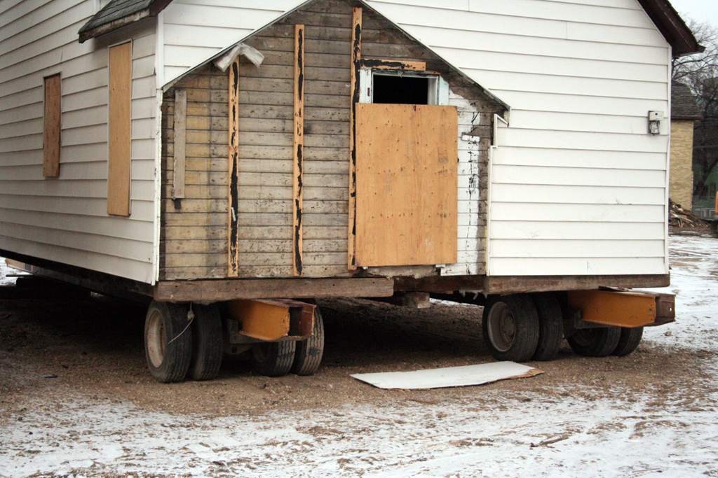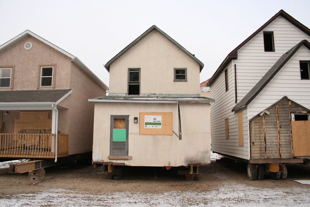 On the outskirts of Winnipeg, and I imagine in many North American cities, there are house shops with a collection of brand new houses ready to truck to the buyer’s site. They stand on stacks of wood ready to be moved. When the rollerskating rink closed on Portage close to Downtown these houses resembled a second hand house shop. In fact they were being taken from the site (in 2007) to be reused elsewhere. They look like standard pattern book houses but apparently required quite a few adaptations to their new location due to context specific aspects such as rights of light and overlooking. Note the truck wheels already under the houses ready for their move.