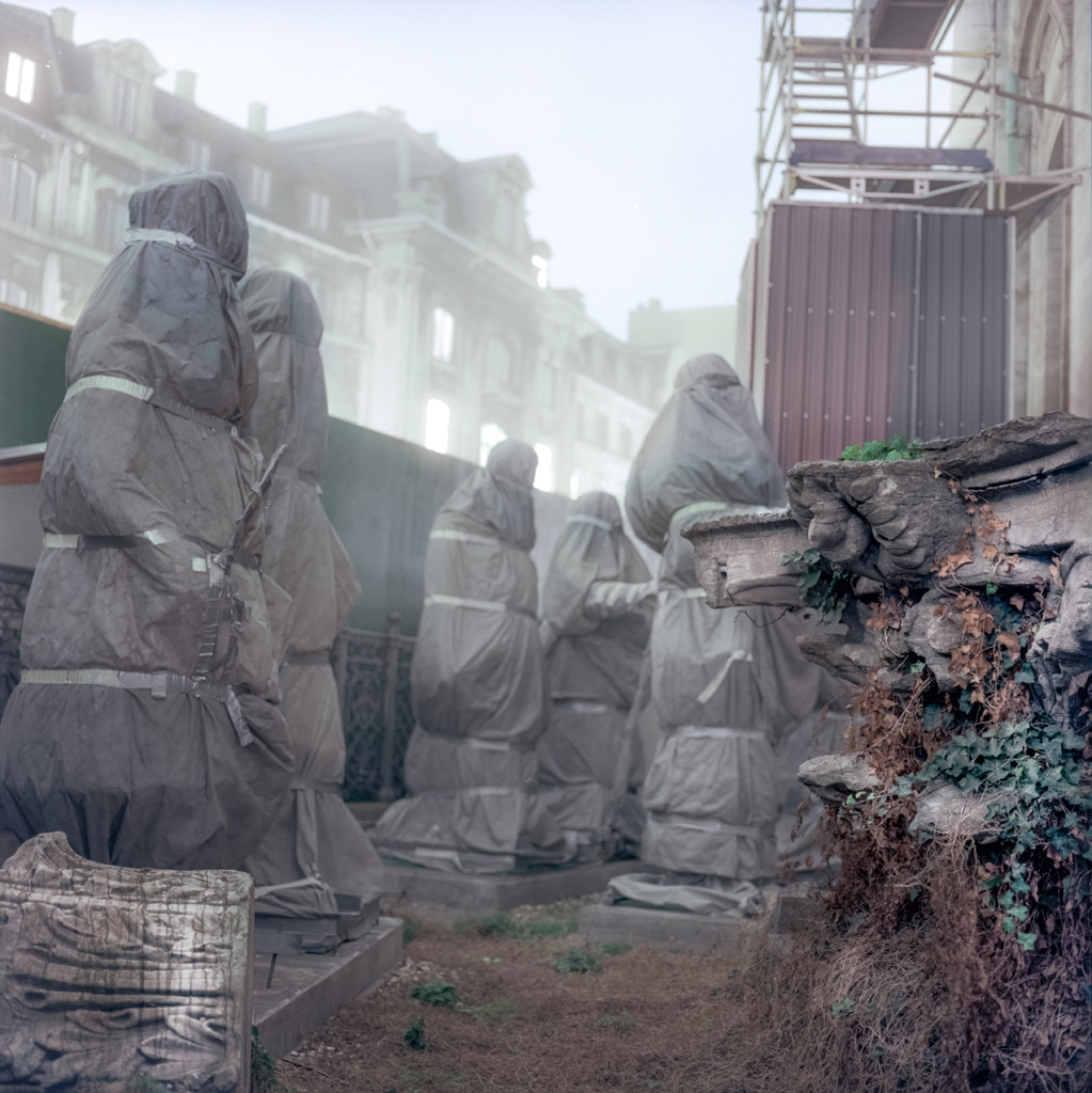 Frederik Petersen sent me this picture of the Marble Church in Copenhagen under restoration. Many stone garden statues are covered over winter to protect them from frost but the protection to these is about as sinister as I have seen.