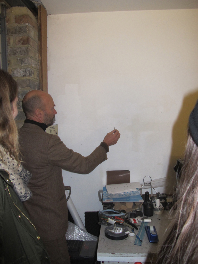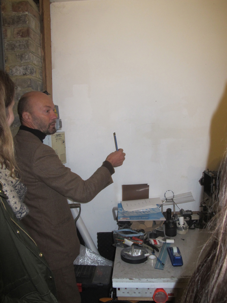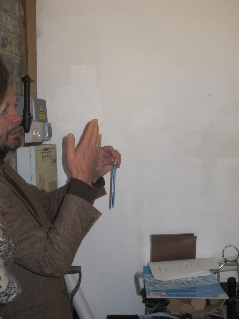 We visited Steven Pippin’s studio yesterday – here he explains the collapse of the universe and the basis of his Omega = 1 project by drawing on his workshop wall. Lots of stunning work.