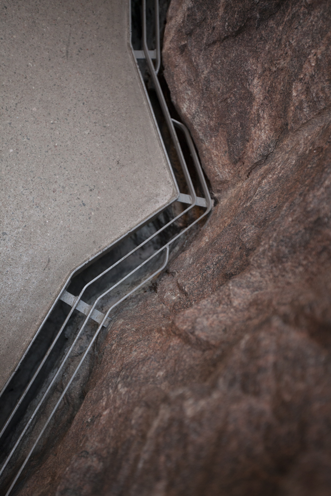 The Temppeliaukio Church by Timo and Tuomo Suomalainen (1969) is carved out of the rock in central Helsinki. There are lots of thoughtful details to make the whole idea work, including a sort of verge at the edge of the floor, where the wall descends beneath the concrete slab (see second from last photograph, with location specific adaptations to grate).