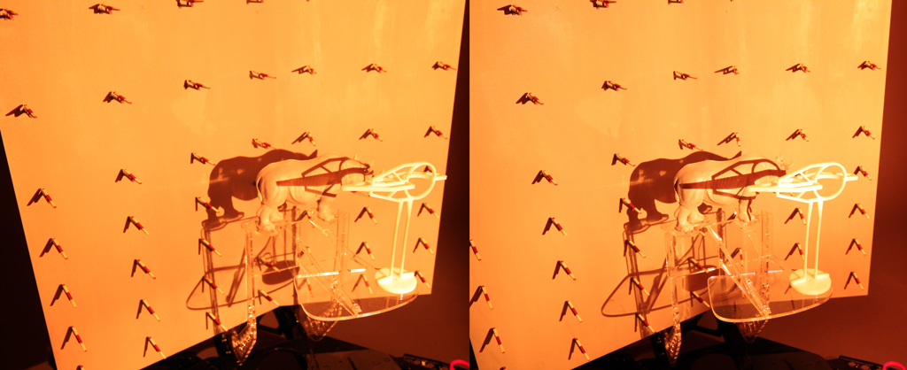 Two stereoscopic views of Instrument Nine in action. The shadow of the rhino sits just off the screen. The shadow of the shadow maker floats in front of the rhino (see the parallax between the shadows on the rhino’s rump). Both are quite subtle distances off the intended screen. I will make some tests to see how far I can push them without getting eye strain, the problem with the first iteration, Instrument Nine (a).