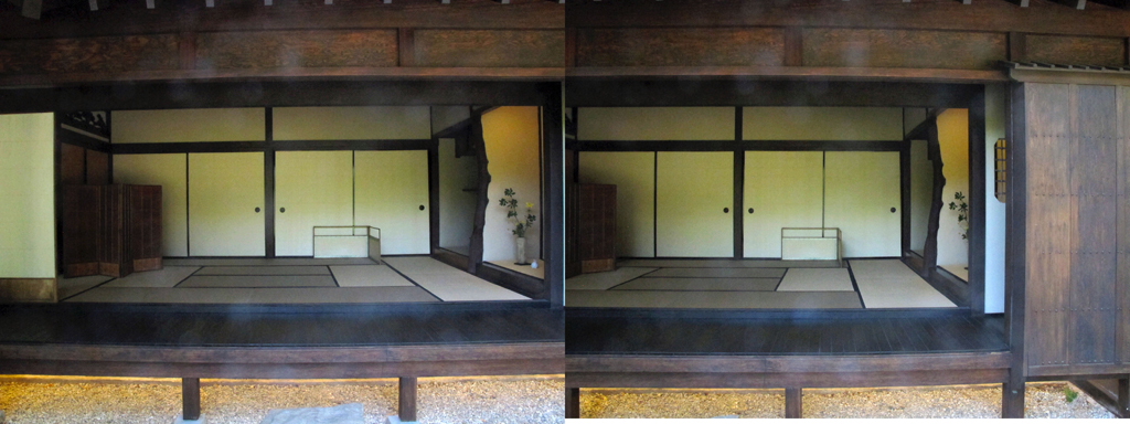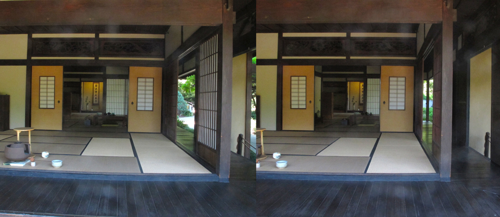 Some stereoscopic views of the Japanese House at Huntingdon Gardens. To view, go cross eyed until the two images register over each other (vertically as well as horizontally). Concentrate on a fairly central and prominent feature to help you achieve this. When the image clicks into place, try to relax and hold it for a while – the stereoscopic depth should develop as you do so. If you are having difficulty, try making the images smaller. A couple of them have quite a pleasing depth when seen stereoscopically so give it a go.