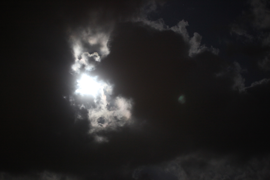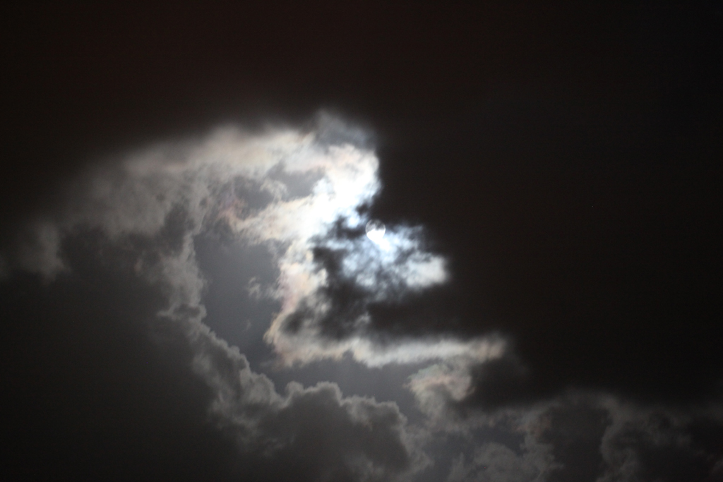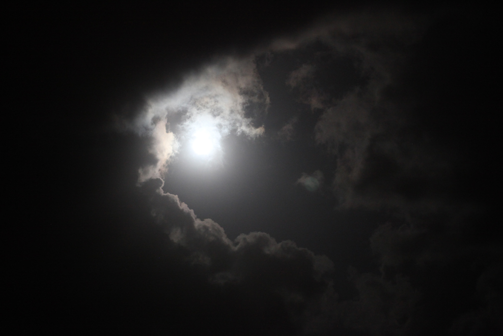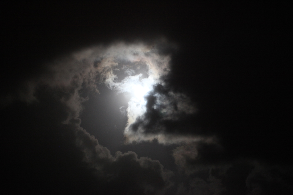The moon is supposed to be close to the earth at the moment, so appears larger and brighter than normal. We have the tail end of Hurricane Bertha passing through, but occasional Joseph Wright like snippets are apparent through the clouds. See: