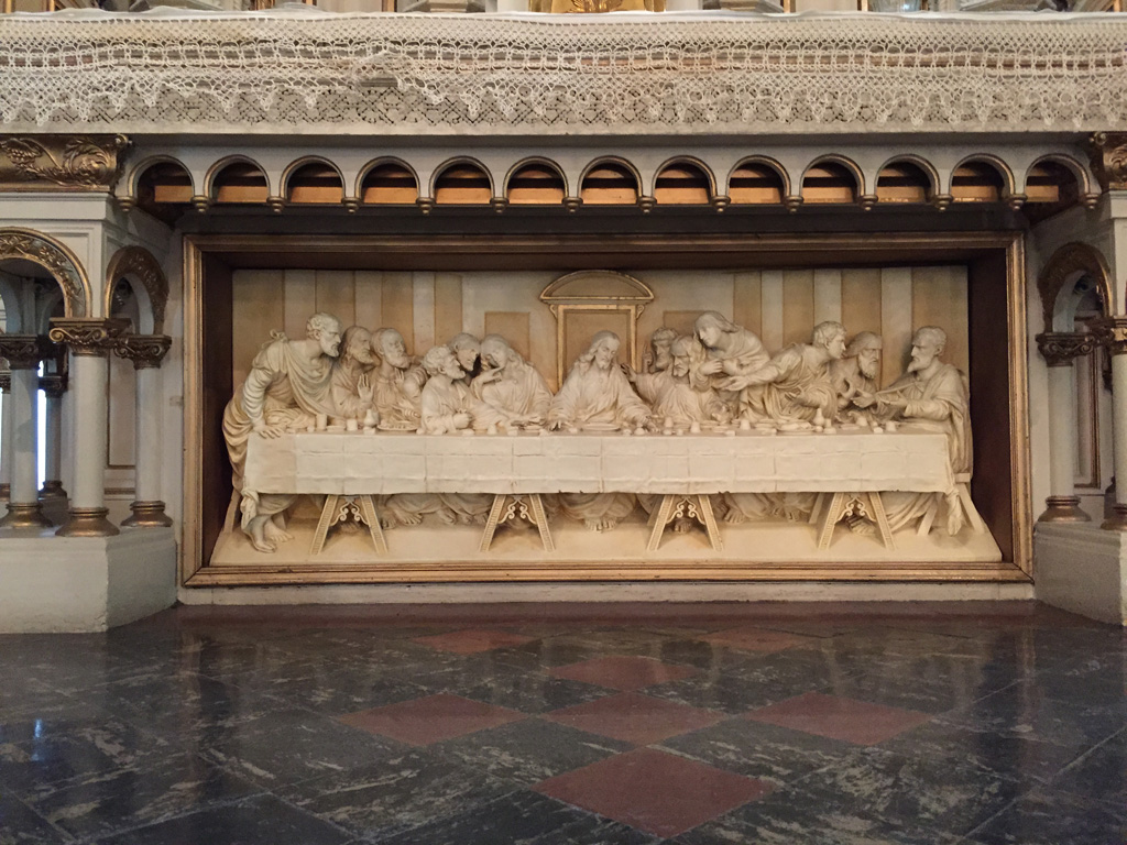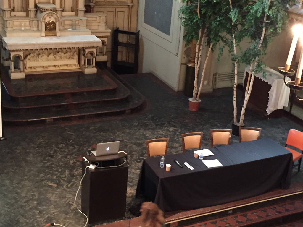 I am at the Reimagining Resiliency Conference in Montreal, held in a (disused) church. As is usual in such instances, there is a table for the speakers of each session where all at the table face the same way. Less usual is the backdrop, where a sculpture of another group of people sit at a table all facing the same way…