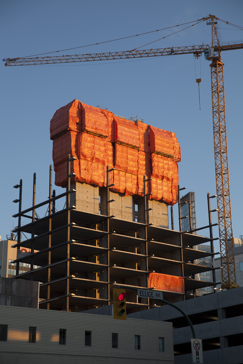 This is the same tarp that a couple of correspondents sent in over the winter, where many construction sites in Winnipeg are covered by Orange tarps to help keep out the extreme cold. It is still protecting the same slip casting in the summer. Most of the tarps give way to reveal beige stucco. It is not being too cynical to imagine this example to be in its finest moment.