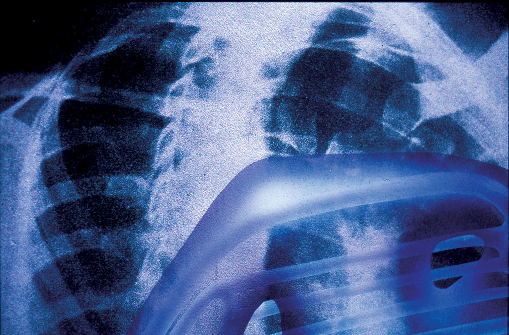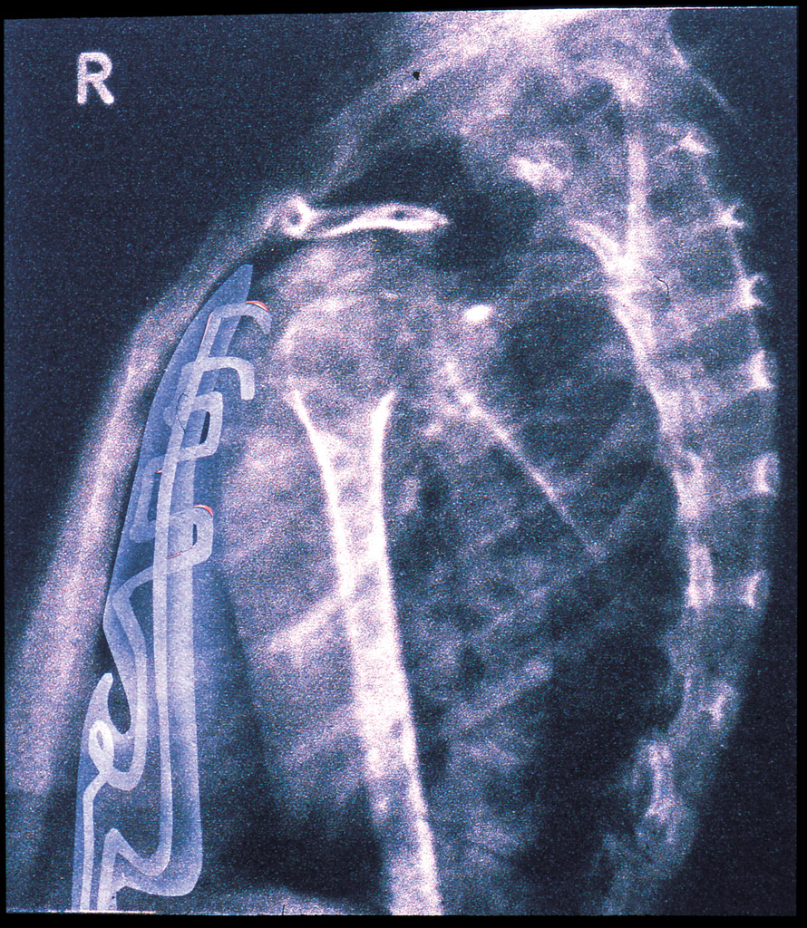 In the positioning picture (2B) you can see a filter under her skin just above her forearm and the top of the breathing/cooling components just below her collar bone, the piece that is visible in the X-ray.