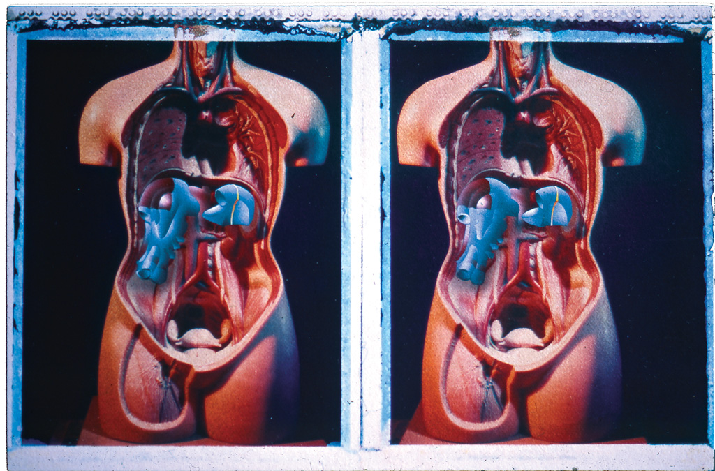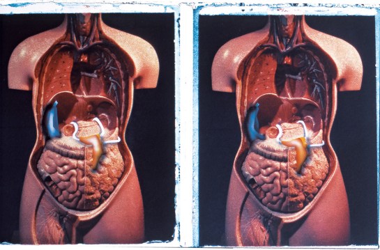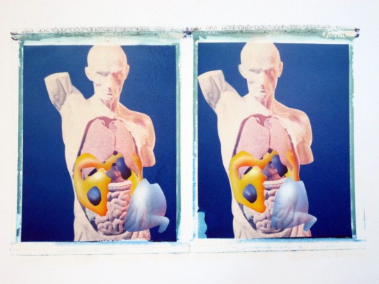 The body project drawings are made on Polaroid transfers using type 59 film, taken with a 5″ by 4″ view camera. The Cambo camera I use has just enough movement side to side to take a left and right eye shot without moving the tripod or camera’s monorail (when photographing the anatomical torso at the distances used in these shots). If you look at the first body projects in the second post there is no compensation for the position of the figure in the frame, while in the subsequent projects I used the horizontal shift in the film plane to locate both images in the same area of the frame. Despite this, the imprecise nature of making the transfers makes it hard to register the two images centrally on the stretched watercolour paper (I was using a heavy grade of Fabriano Five). When you see the frames lined up the pairs of images are noticeably irregular.