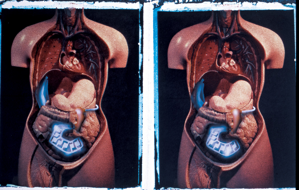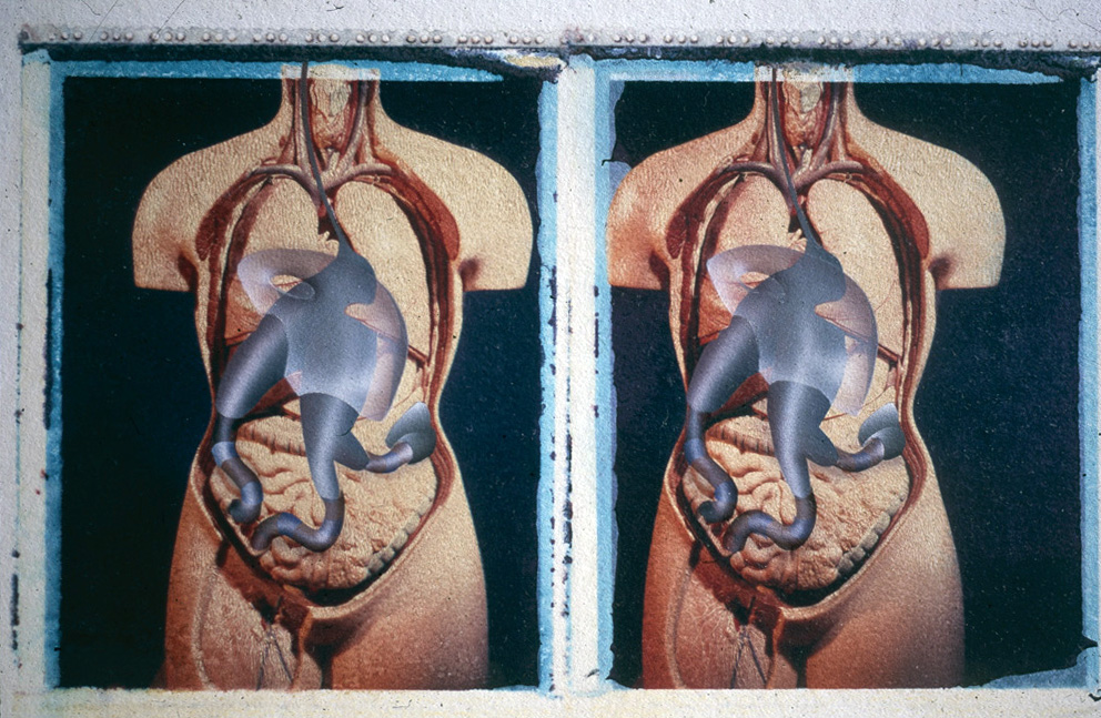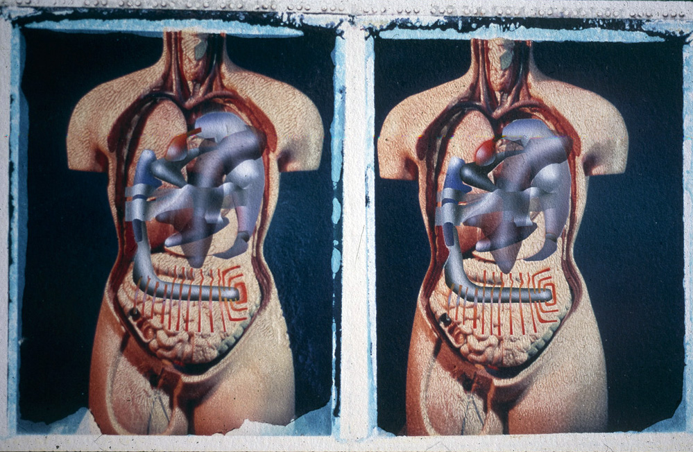The top layer includes the air handling vessel that works as a constant volume inverse of the natural lungs, and breathes through one of the abdominal filters. The drawings are airbrushed over the already unreliable polaroid transfers. Several of the layers are transparent so cannot be painted over if the work goes wrong. Working without an undo button can help one commit to something…