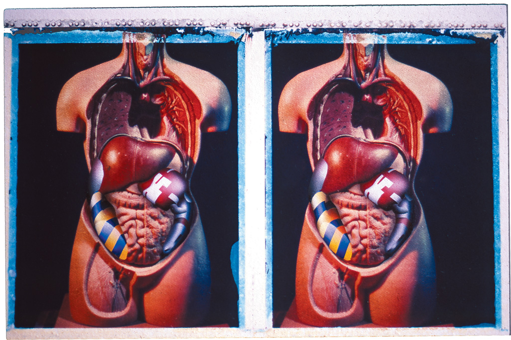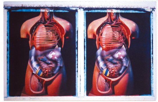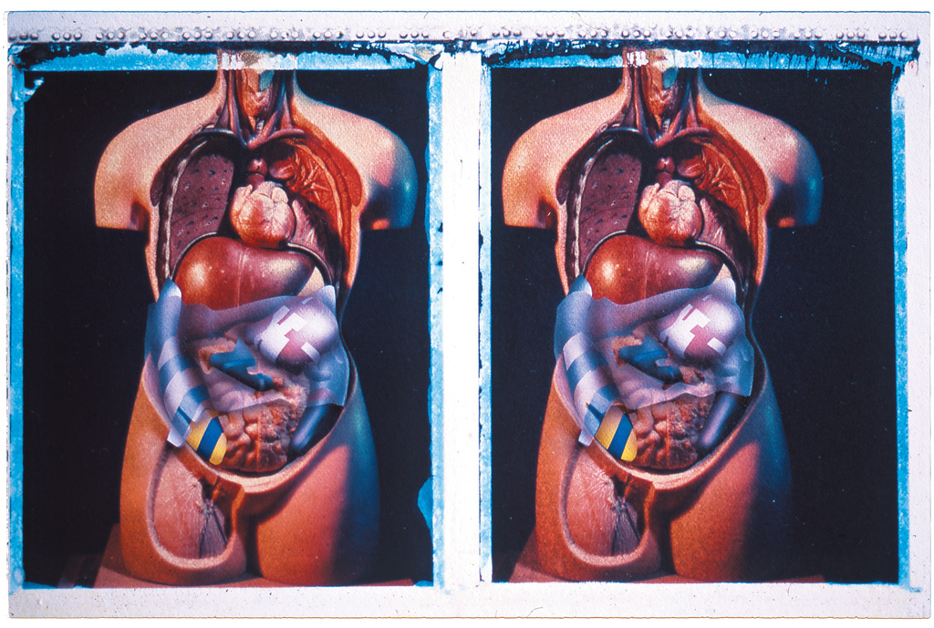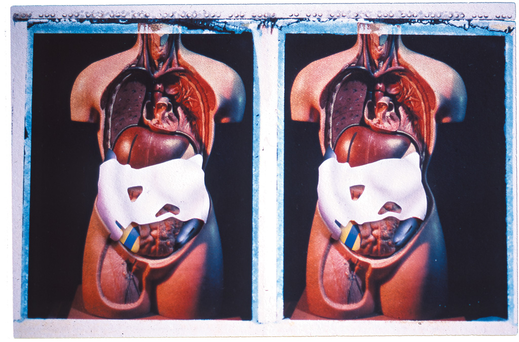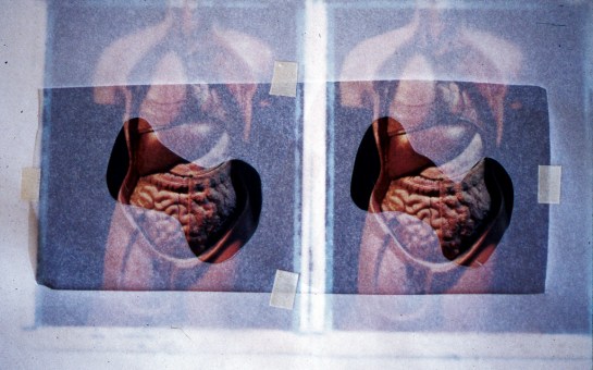Layer five shows a heat shield. As with the previous body project, all the drawings are stereoscopic and made over polaroid transfers. The polaroid photographs were made from an anatomical torso borrowed from UCH in London.
