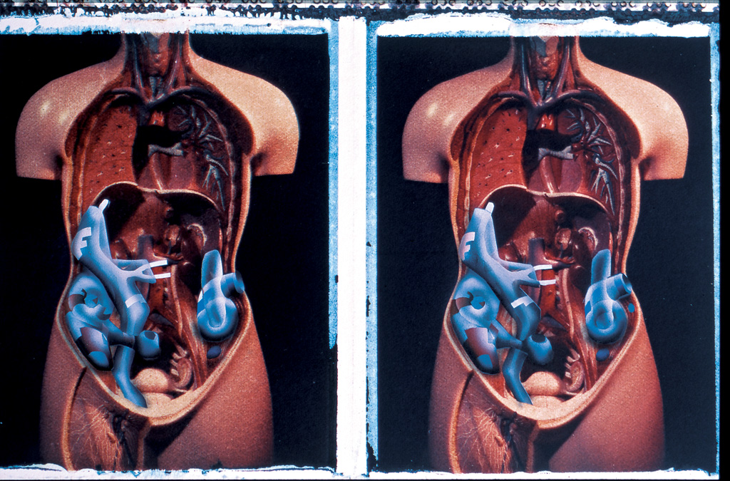 One day while I was working on the second body project (previous post) I was drawing on a pair of images in the morning. So as to protect the rest of the image I placed a paper mask (see the image above) that exposed only the area I was working on. I placed masking film over that area and cut out my masks for airbrushing with a Swann Moron scalpel. That afternoon I had an appointment at the hospital to examine a mole on my abdomen that was growing at a worrying rate. On seeing my mole, the doctors decided to remove it. As I sat there they gave me a local anaesthetic and then placed a paper mask around the area, mostly I believe for my modesty. Then they cut into my abdomen with exactly the same sort of scalpel I had been working with that morning. As they cut around the mole into the fatty layer under the skin to make sure they had captured everything. I was looking through a paper mask to the inside of my body just in the same way I had looked at a similar area of the body in the drawings.