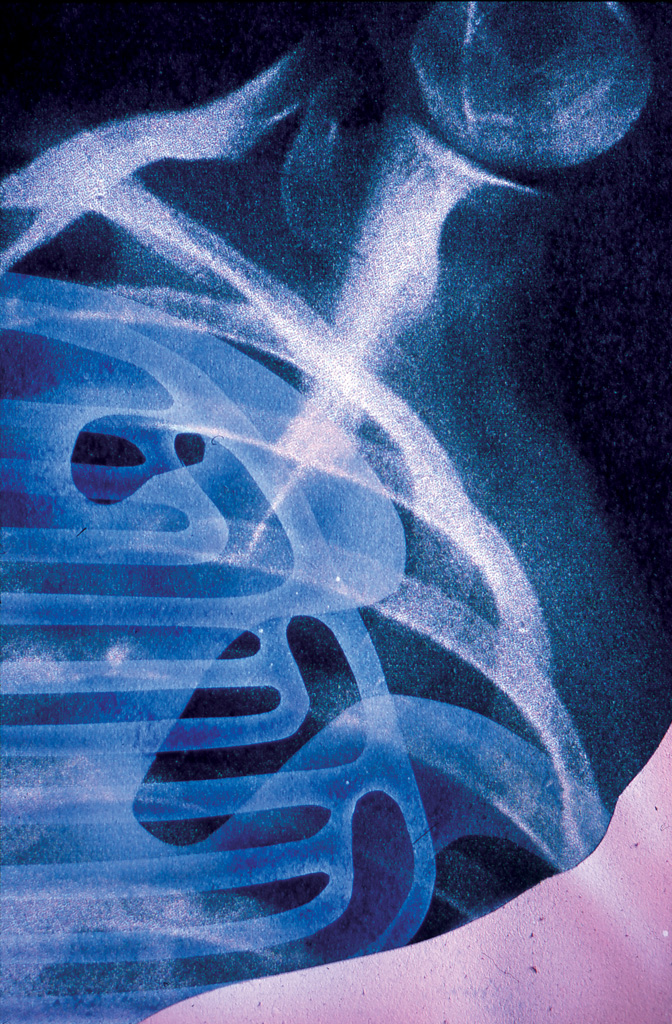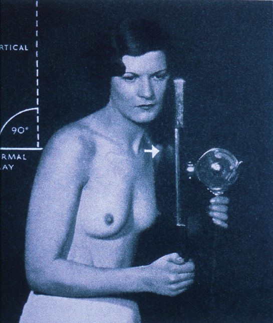 X-Ray 3A is not from Positioning in Radiography, but 3B is, the positioning to take the image in 3A. The X-Ray shows the selective revelation of the intestines through the agency of a barium meal – tissue that would otherwise be transparent to X-Ray shows up due to the meal. The image is unlikely, as the synthetic organs of the new apparatus should divert toxins through the synthetic system (and therefore reveal them more fully) so we have to assume that the apparatus has been turned off to check the natural organs. In the positioning photograph you can again see discrete bumps around her waist and abdomen where the apparatus pushes into the skin.