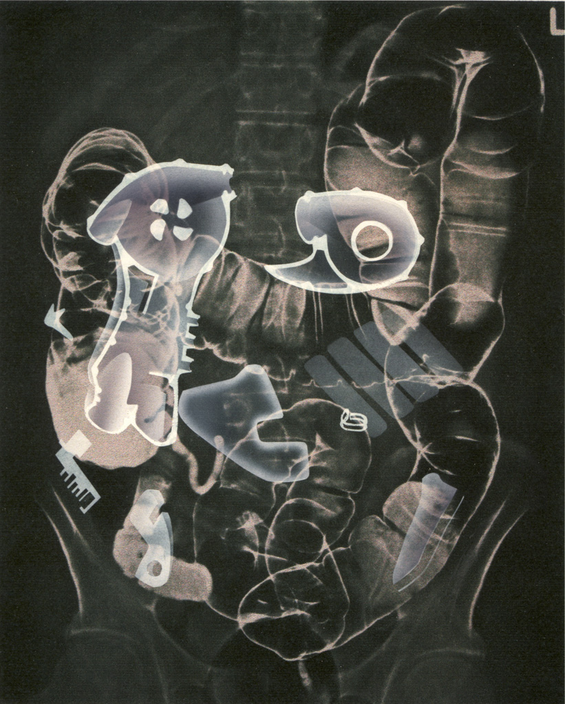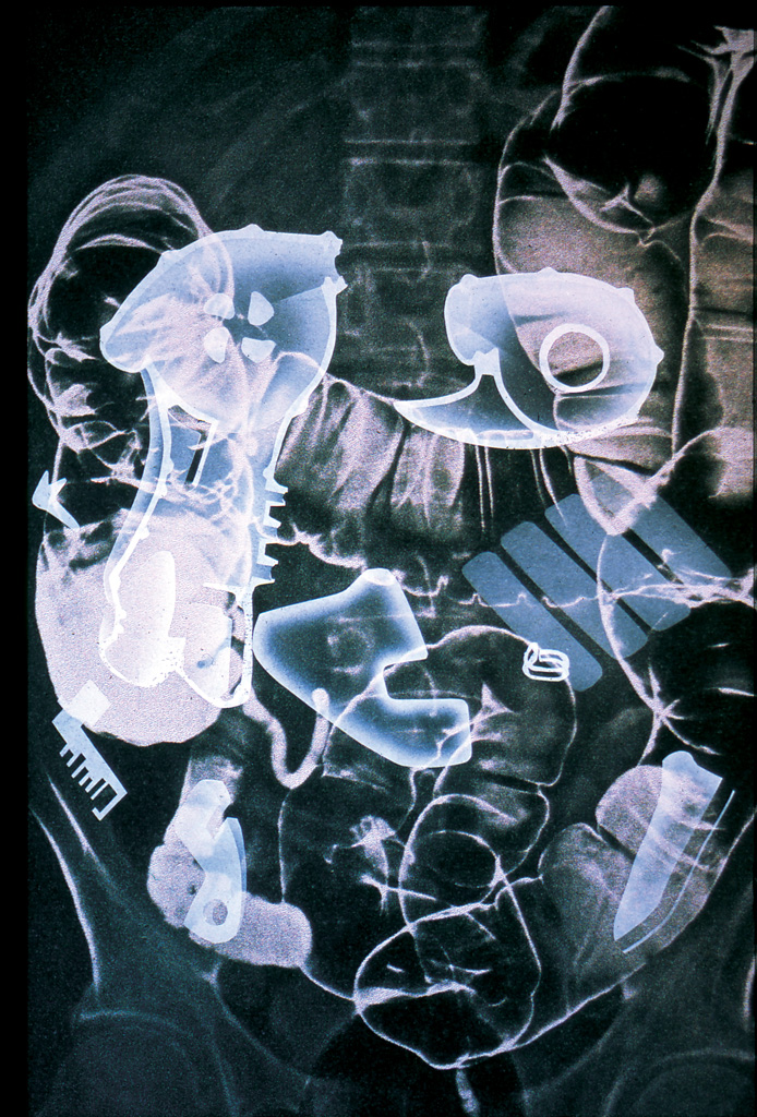 Each X-Ray shows parts of the new body apparatus but they are available to this sort of inspection selectively, so not everything is visible. The positioning photographs display a formal transparency of the apparatus, again selectively as only those parts that press against the skin are visible.