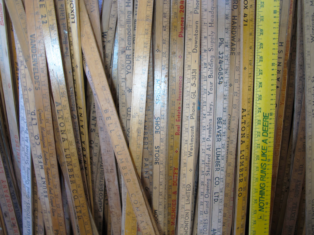 Part of the yardstick collection. It started with a need for one (for a project) and, as these things do, it got a little out of hand. Almost all of them are from Winnipeg, mostly advertising for lumber yards, piston ring suppliers (these normally have numbered holes in them, I believe to put the engine valves in), fabric suppliers and some quite specialised bed spring measures. The oil company ones tend to be square in section.