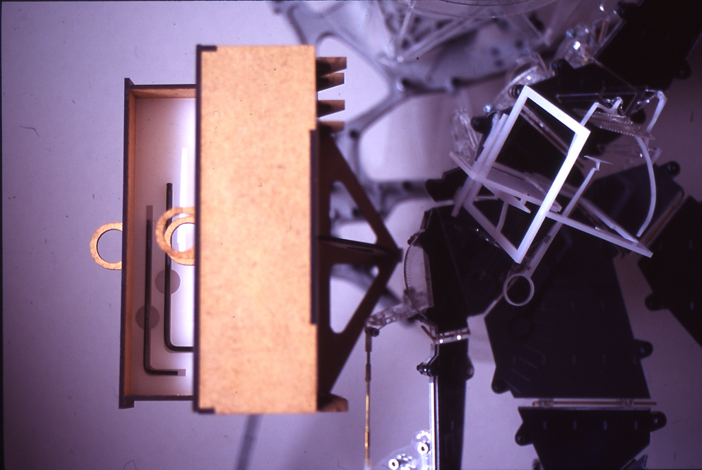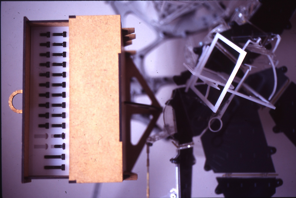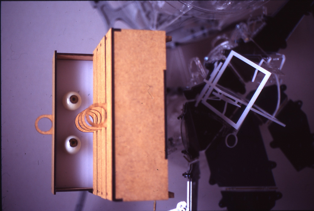 The contents of the bottom drawer is a Victorian pari of glass eyes in their uncut blown state. They are set 65mm apart (the typical separation). They are a reminder of the ambiguous state of the instrument in dealing with the pictorial structure of the picture plane, which negotiates between the three and two dimensional worlds.