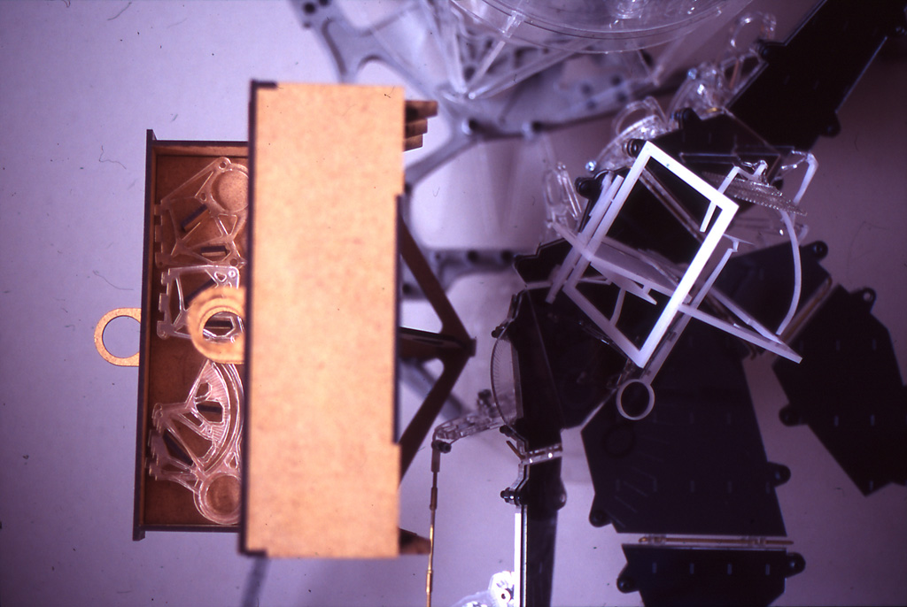 Three views of Instrument Six in action, the two top views construct paradoxical shadows that float in the air, adjacent to the surface you would expect them to land on , in real time. The bottom image is of the instrument in photographic mode where the relative parallax between shadow projections can be adjusted for pairs of stereoscopic photographs, and it uses a single lightbulb instead of a pair of candles.