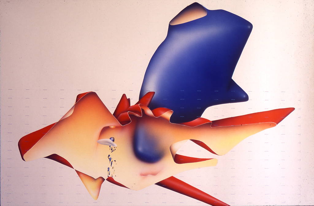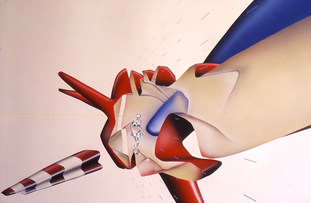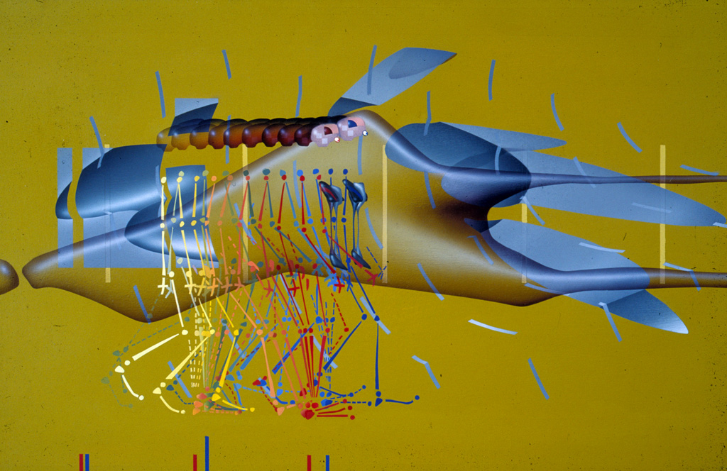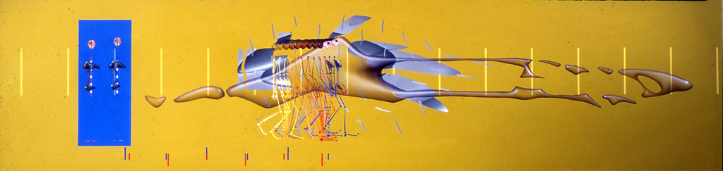 These two studies are from 1993 and follow on from the long yellow drawing at the end of the post before last. The vertical yellow lines in that drawing were a note that the construction did not include an idea of context, and these were attempts to imagine how signals in the ether would register on the walls of the architecture (which were sensitive to electronic signals in our skin). As before, these are stereoscopic pairs and make more sense seen in 3D.