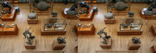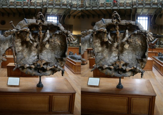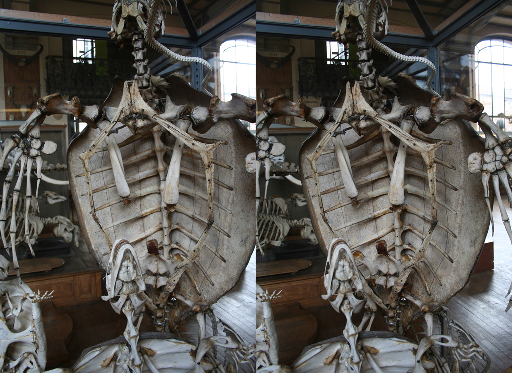I posted some tortoises earlier that had only vestigial spines and few if any ribs, using their shell as a stressed structure. These, from the Museum of Comparative Anatomy in Paris, have a complete spine and ribs. It works quite well in stereo, so have a go.