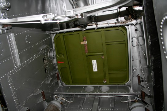 Like many architects I am fascinated by aeroplane construction. The B29 is particularly interesting due to its circumstances. It was designed and developed to be built with less skilled labour than had been the case with earlier designs and was made with as simple shapes as possible. The B17 is a flow of compound curves but most of the B29 is a cylinder and a cone. The junction of the wings are not blended as in the B 17, but have small fillets. The performance is realised through detail rather than idealised form. A lot of attention is lavished on the front wheel hatch. On the outside (above) the double curvature surface is inherently strong and is kept smooth for the wind with flush rivets. When the ‘plane is landed there is a large space within the hatch where the wheel used to be stowed. In an elegant innovation this space is used as an entry hatch for the crew to enter the ‘plane, so that openings that weaken the airframe are kept to a minimum (below).