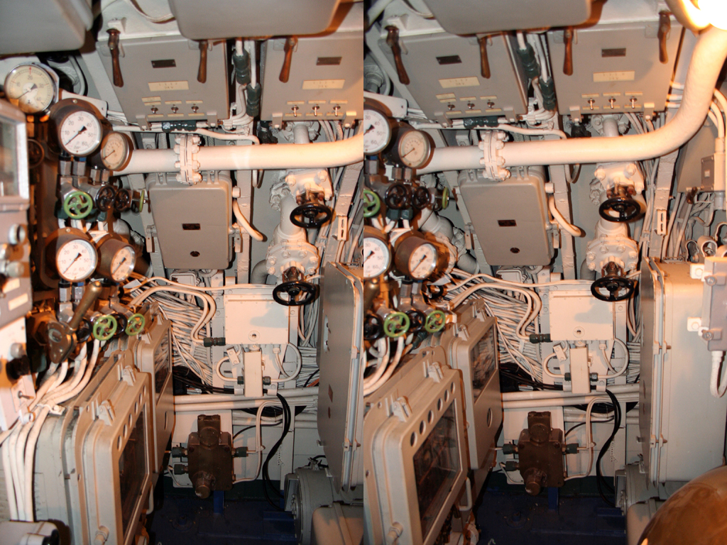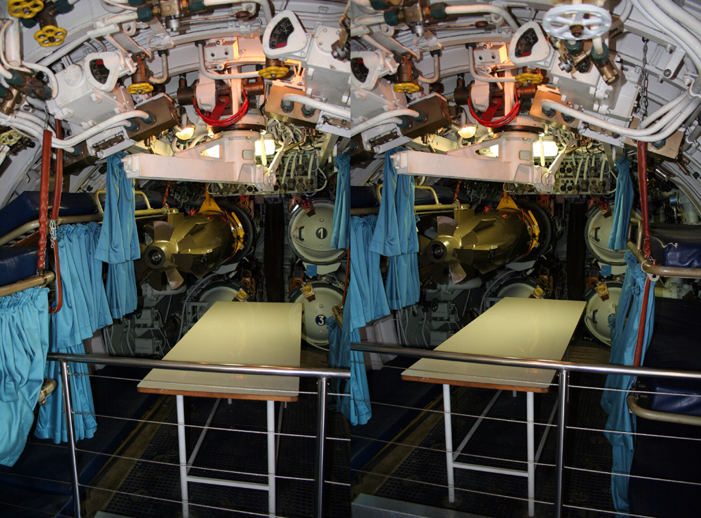 Some more stereo views of the interior of the Nautilus in Paris. The difference between seeing the two dimensional image and the stereoscopic three dimensions is pronounced (view in the normal way – or check back a couple of posts for the most recent suggestion of how to view stereo pairs). I have been in a few submarines and am intrigued by the nature of space made almost entirely by programme – the equipment that lines the habitable volume. I took these a few years ago and it was when I sent another pair from this series in an E-mail discussion with Perry Kulper that I discovered the possibility of how to float shadows in space (posted in the earliest post on Instrument Six).