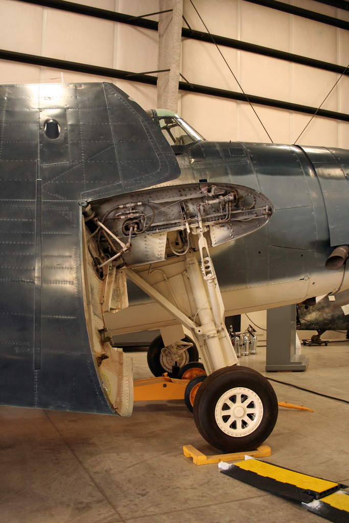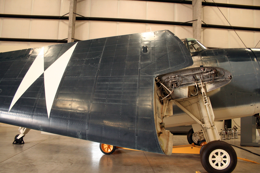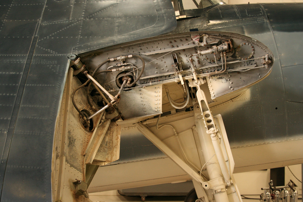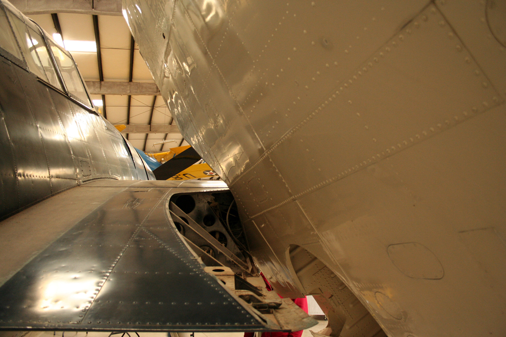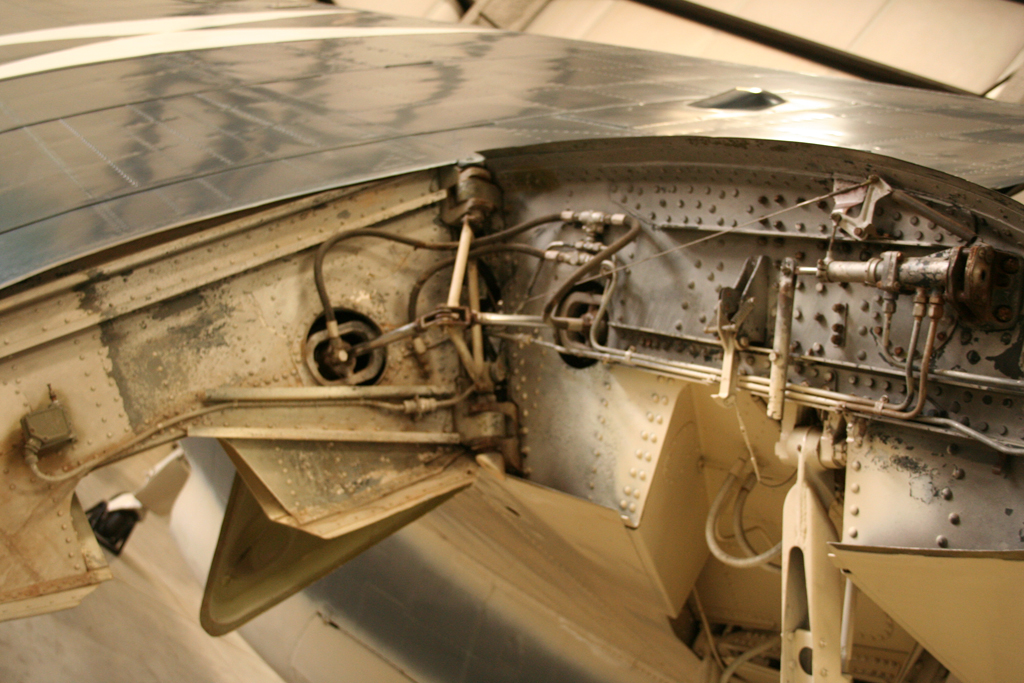 I posted pictures from a similar ‘plane from Duxford a while ago. This one is from PIMA and shows the hinge that allows the wings to be swept back for storage on an aircraft carrier. There is a single axis hinge and one flap that falls down to accommodate the movement and then come back together with a continuous aerodynamic surface. It must have taken some working out – I wonder if this was done through drawings or models?
