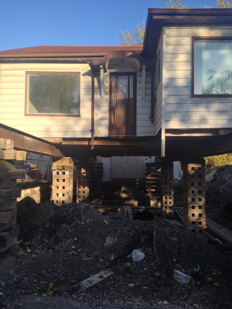 A surprisingly common sight in Winnipeg – houses raised up while new higher higher or deeper basements are built underneath. The ground is an aggressive clay that leaves many houses heaving in strange directions.