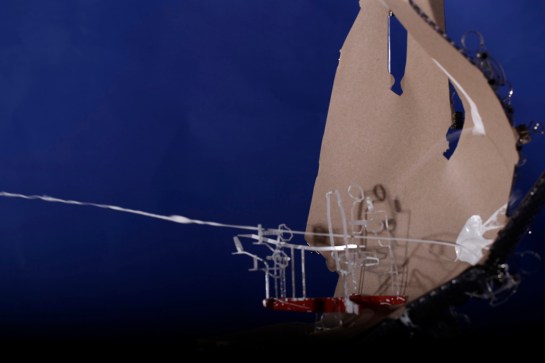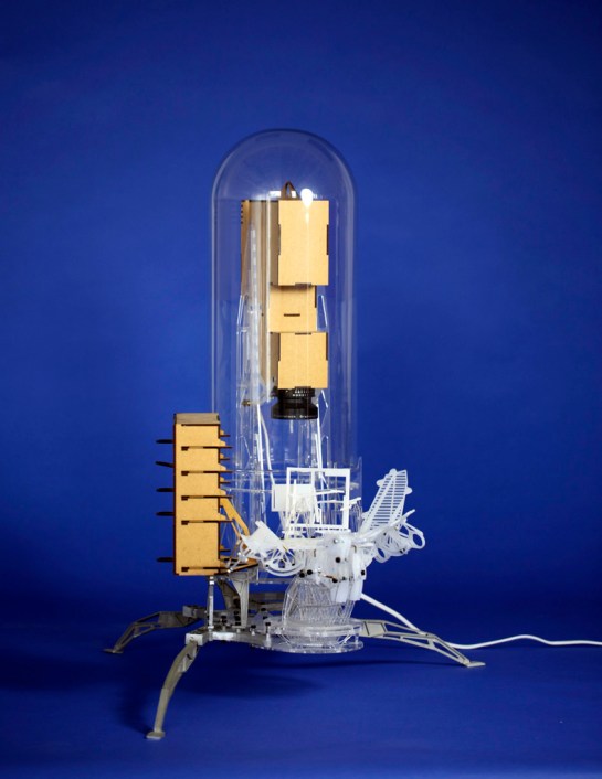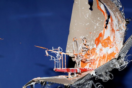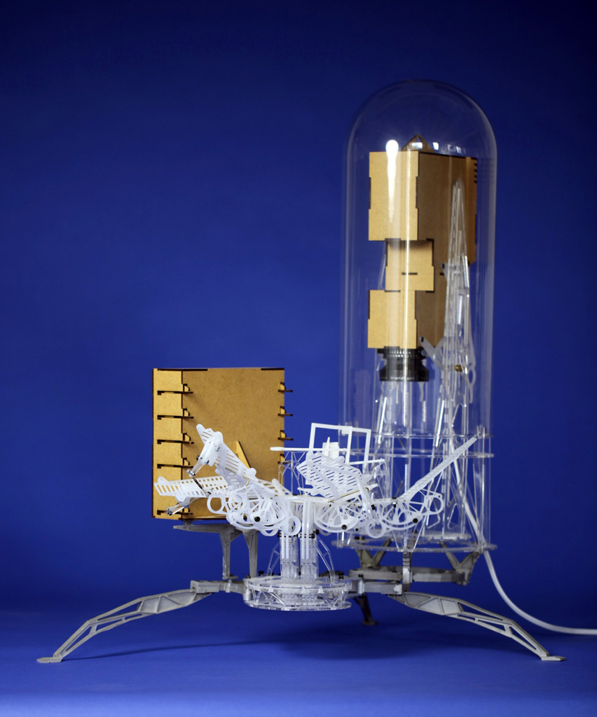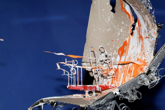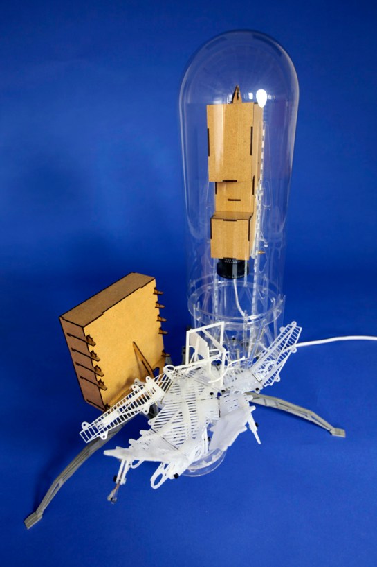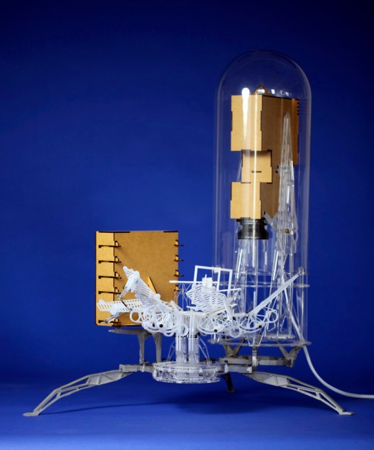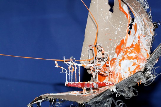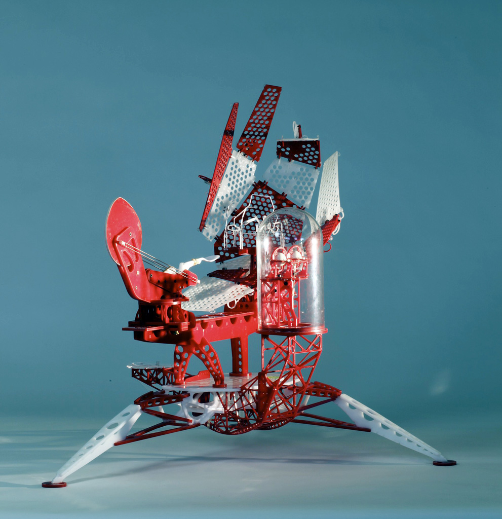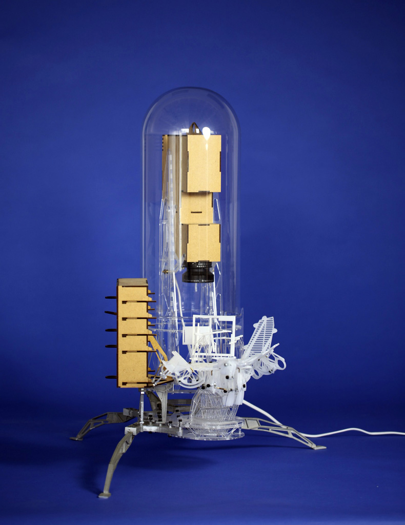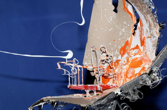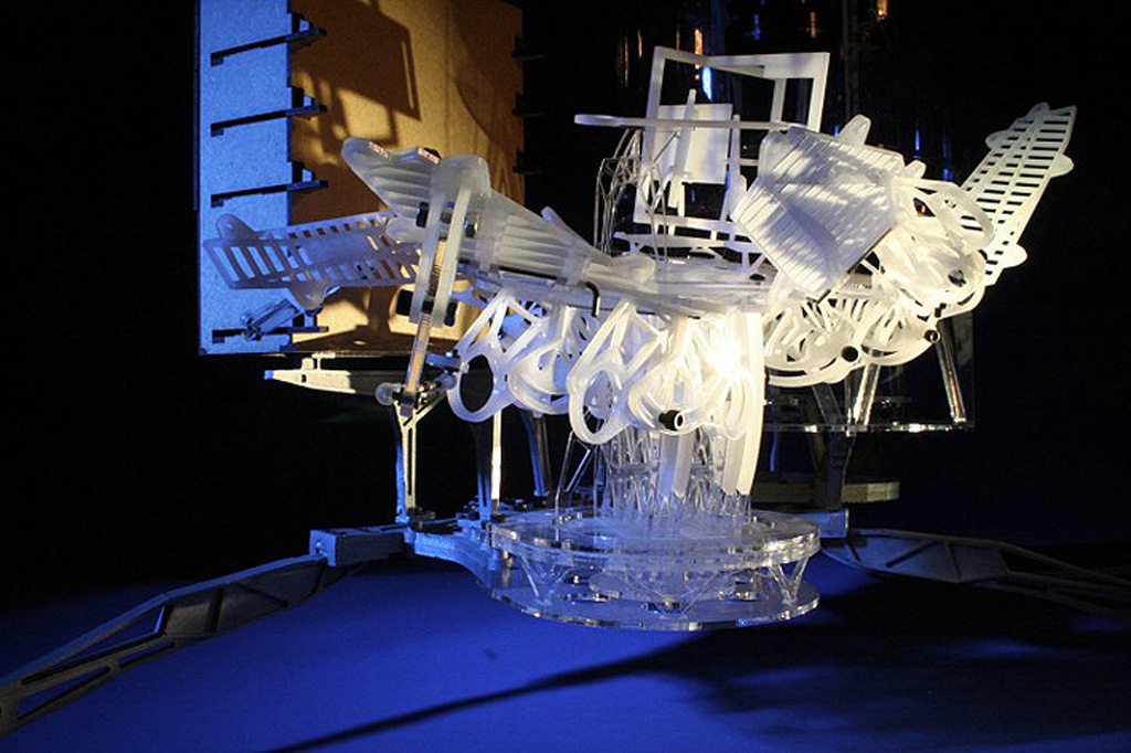 As an analogy I said that they were a little like the interior of a submarine that was made up entirely of programme and not of passive elements. My friend e-mailed back to say that he had not been in a submarine so I assembled and sent off a pair of stereoscopic photographs I had taken a couple of years earlier showing such a space. After I had sent them I took a closer look at the stereo pair and noticed what was at first an annoying blur hovering in space. Quickly I realised that the annoying blur was on fact the very thing I had been chasing, a paradoxical shadow. It was so obvious how it had occurred that I was annoyed at not thinking of it before. At the time I was working on Instrument Five and stopped work on those instruments to build Instrument Six to play with the possibility of a shadow detached from the surface on which it should by rights be cast. The picture I sent is below but the lower image from another view works at least as well. Tomorrow I will post some more pictures of the instrument and its floating shadows in 3D.