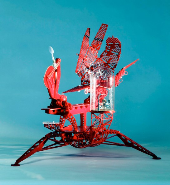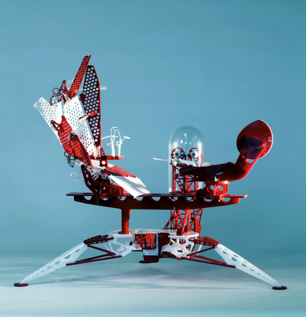 Instrument Seven has the same chassis as Instrument Five but has a new picture plane that sits adjacent to the flight of the paint (see below). The folding picture plane has adjustments between each individual plate plus the whole picture plane can rotate slightly. The plane is set up so that the area closest to the drawing pieces forms a harbour to protect that part from a direct flight of paint. Some of the direct flight can catch the back end of the picture plane (or the front if the catapult is turned far enough.