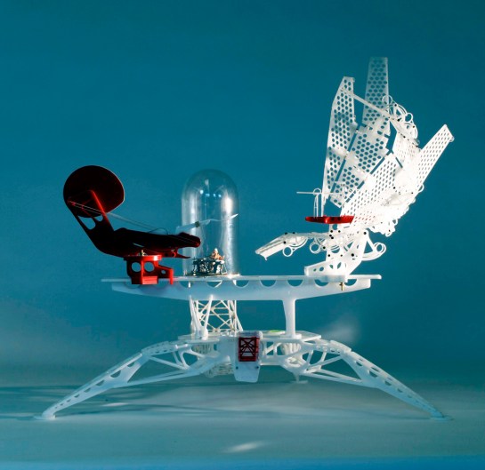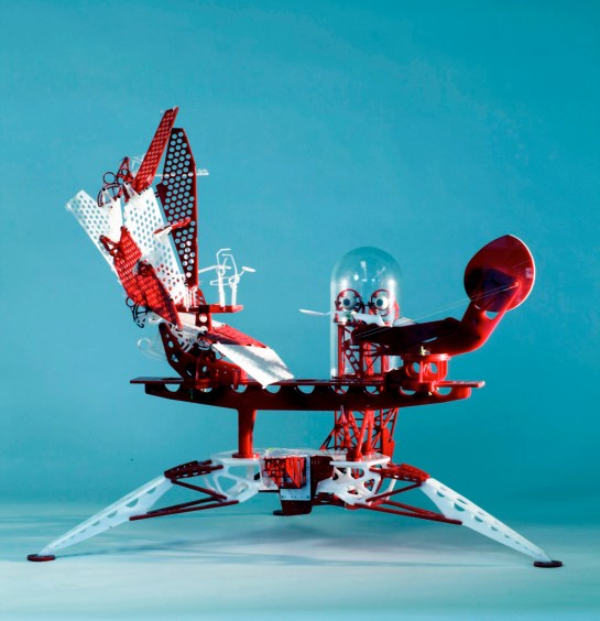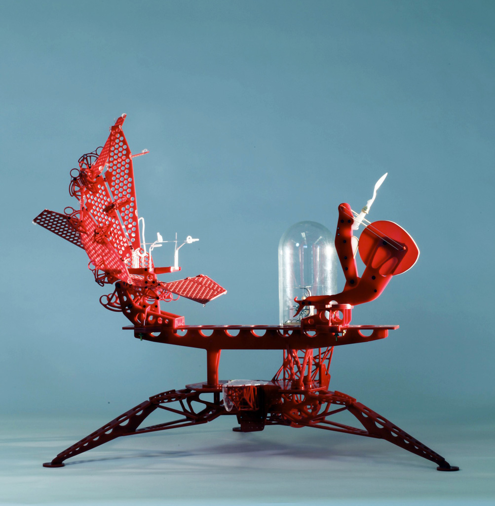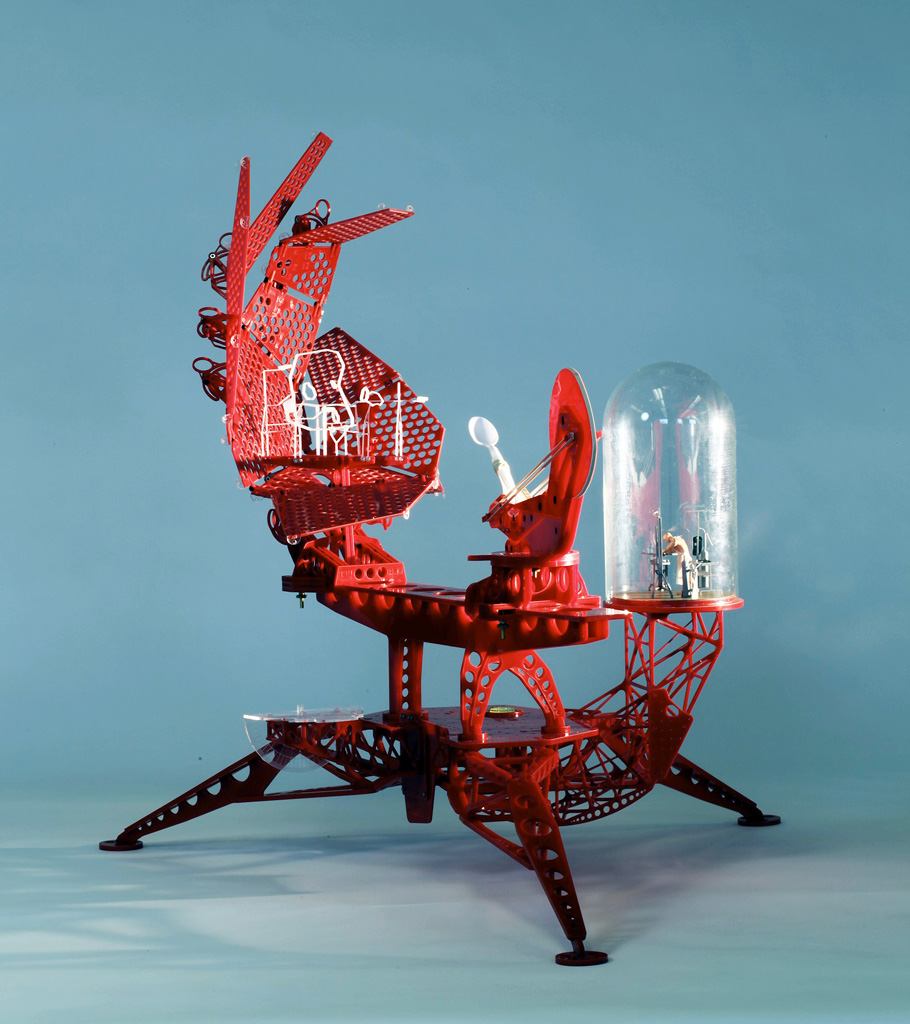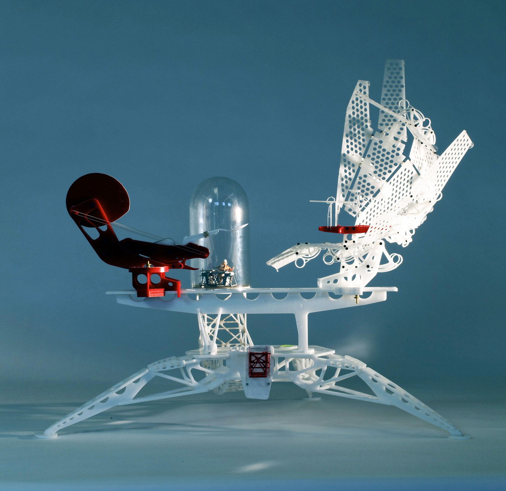 In the picture above you can see the view the catapult that is going to throw paint has of Instrument Five. As noted earlier, having the folding picture plane behind the drawing pieces means that many of the subtle splatters of deflected paint are obscured by the main body of paint that misses the drawing pieces and deposits a large splat of paint on the picture plane. The same instrument can be seen below, showing this relationship from the side.