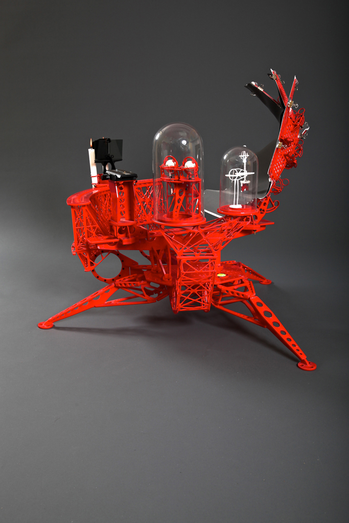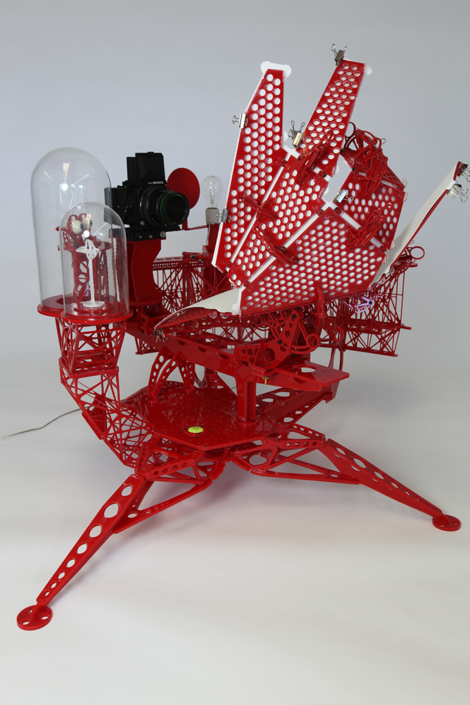 Yesterday I posted a stereoscopic picture of the floating shadow created by Instrument six (which can by definition only be seen to hover stereoscopically). The view is of quite a subtle lift from the surface and the registration lines on the folding picture plane behind help you sense the parallax. Due the subtle lift some people have difficulty in seeing the float, so here is a stereoscopic view of the shadow registered on the screen (in its normal position before Instrument Six lifts it into the space between the shadow caster and the screen). Also a picture of Instrument Six for anyone who is new to this blog.