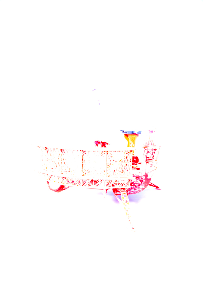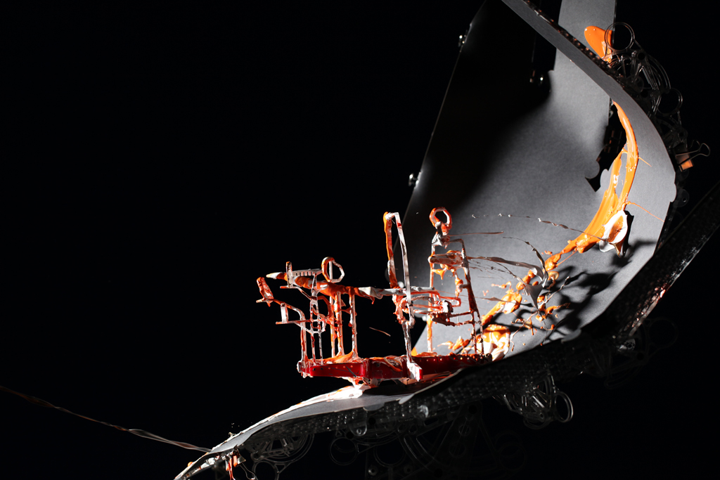 I don’t think I have posted this view of Instrument Five in action before. The throw of paint is almost spent, but the splatter on the backside of the drawing pieces is one of the clearest examples of this series, giving away the range of stories that emerge from the collision between the paint and the drawing pieces. The Paint discusses a certain occupation of the architecture that is modelled int he drawing pieces.
